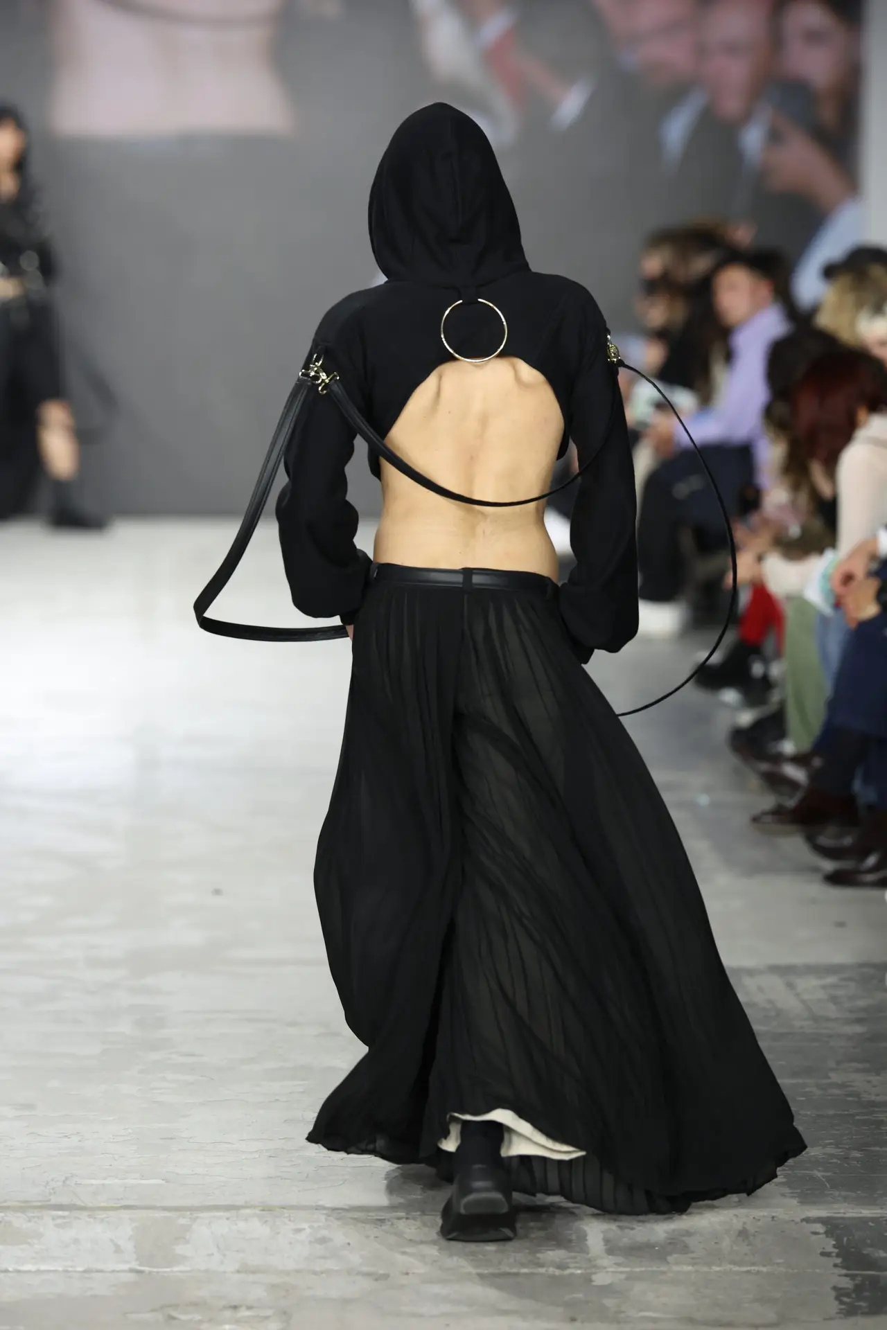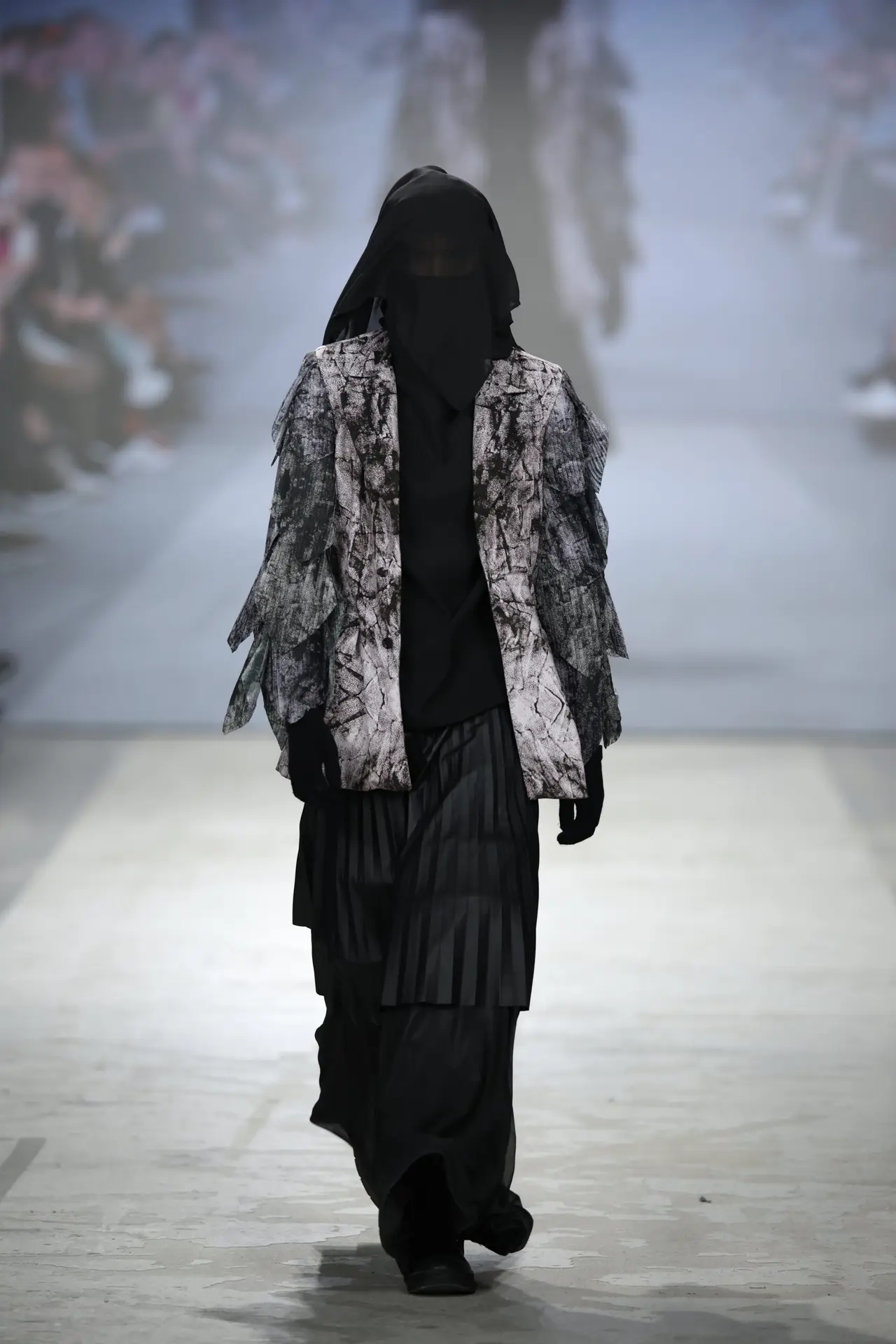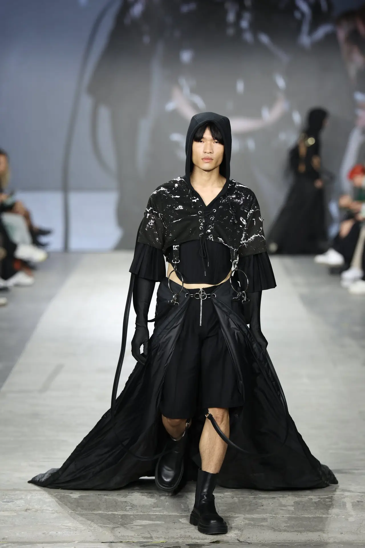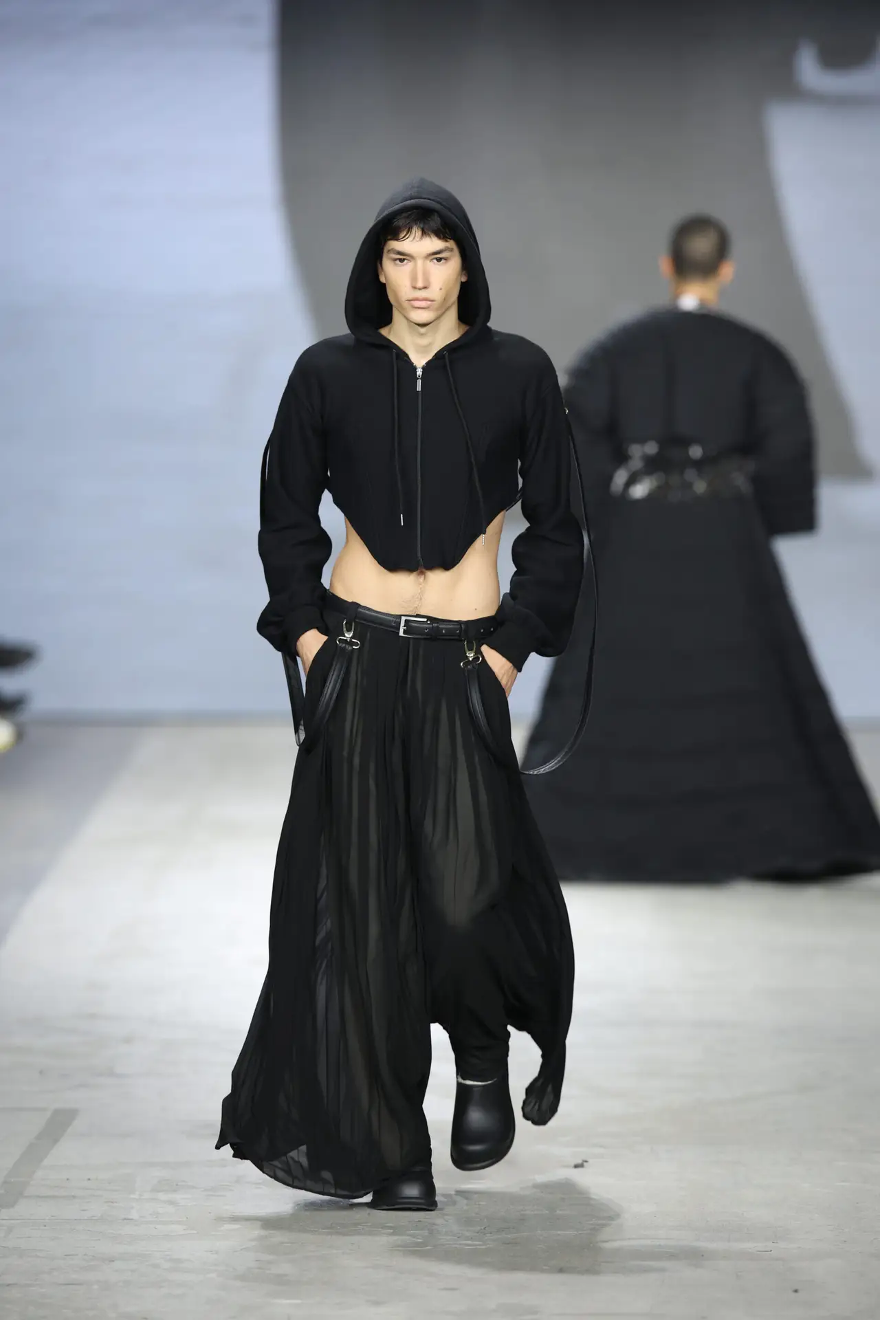 La collezione uomo del giovane designer si basa sul concetto di caos legato al nostro pensiero, alla paura di annegare nella contemplazione dei nostri dubbi intrusivi che si trasformano in incubi e panico e che non smettono di soffocarci mentre lottiamo per restare al passo con le aspettative altrui. Il pregiudizio su noi stessi è un ordine di pensiero ristretto che limita la possibilità di cambiamento imprigionando la realtà in schemi emotivamente connaturati che la distorcono, accentuano, strappano e ricompongono in un insieme grottesco e normalizzante che traspone visivamente il concetto di distorsione. I capi sono trattati come frammenti di una composizione innaturale di idee.