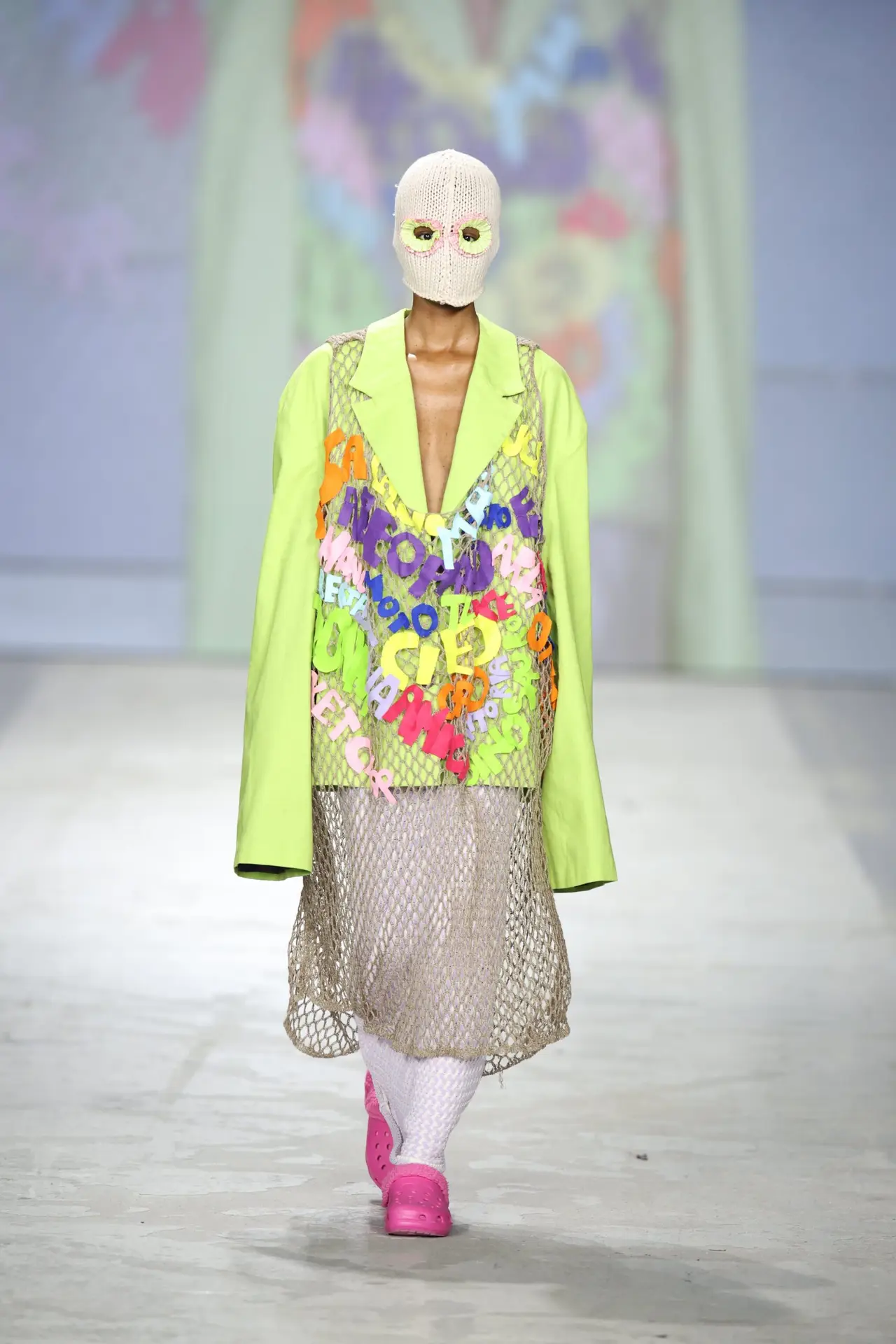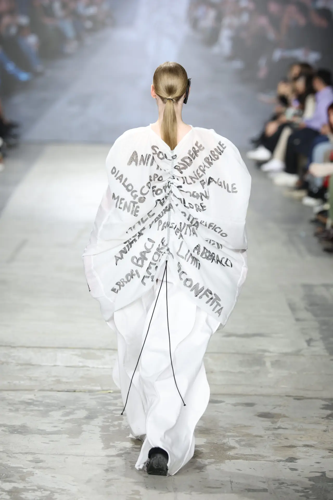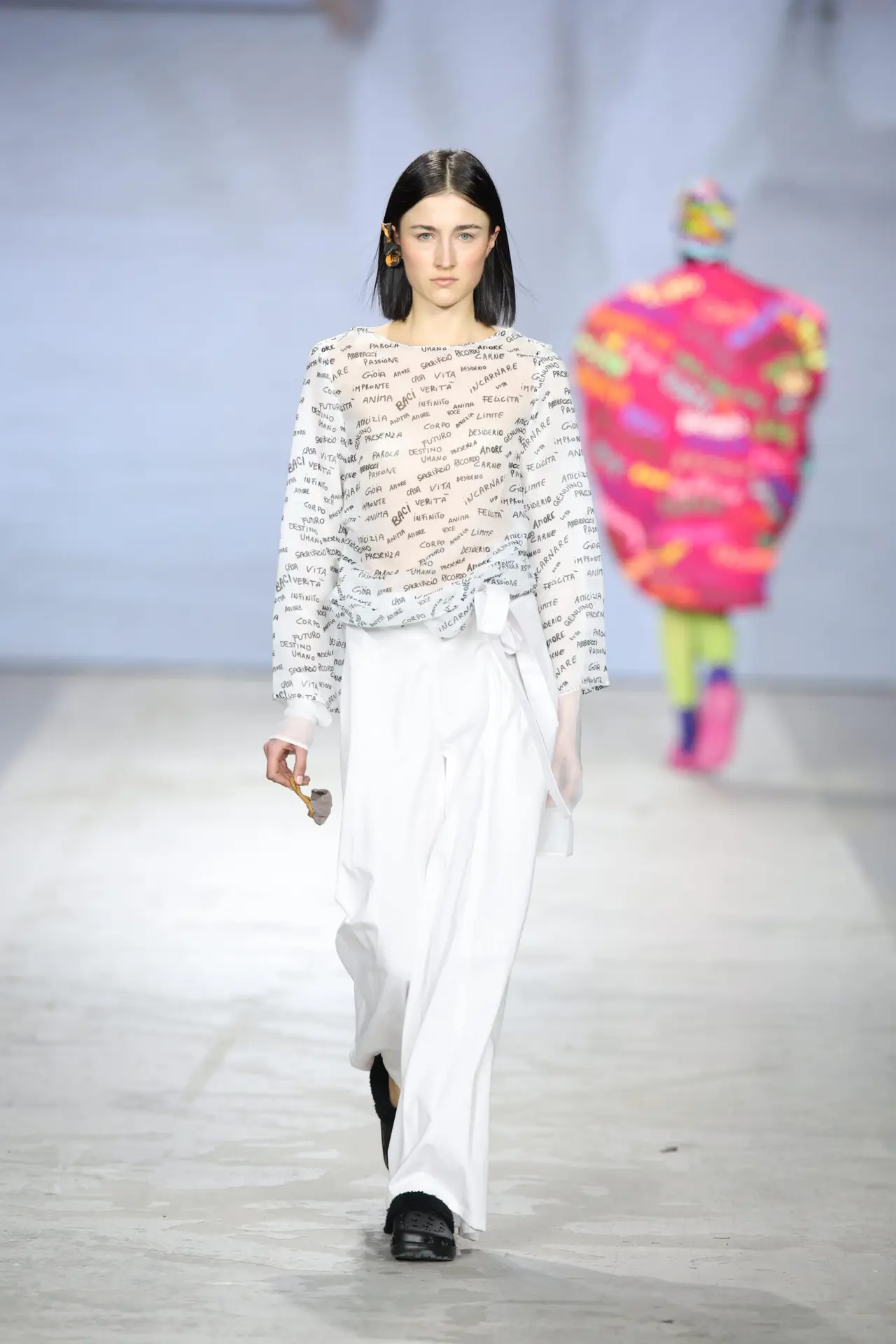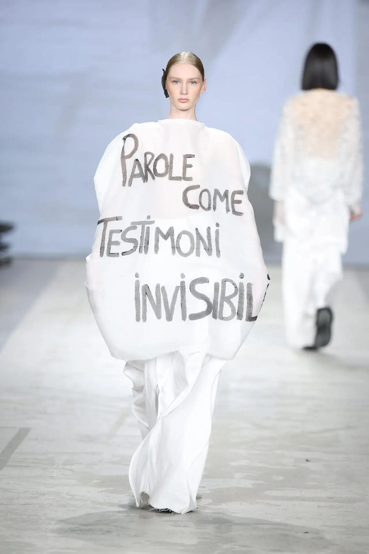 Protagoniste della collezione sono le parole; parole che spiegano i significati di altre. Nel tentativo di annullare questa tautologia la designer si ispira a “LA FAVOLA” testo di Gino Strada che racconta ai bambini l’importanza del loro utilizzo: anche i termini più incoscienti devono essere selezionati, calibrati e usati da una mente cosciente per garantire un livello di comprensione dell’altro che va oltre l’ascolto. Gino Strada per parlare di parole ha scelto il concetto di favola che la designer ha voluto approfondire creando un promemoria per promuoverne il buon uso, un immaginario che invita alla scelta delle stesse per evitarne una presenza assordante.